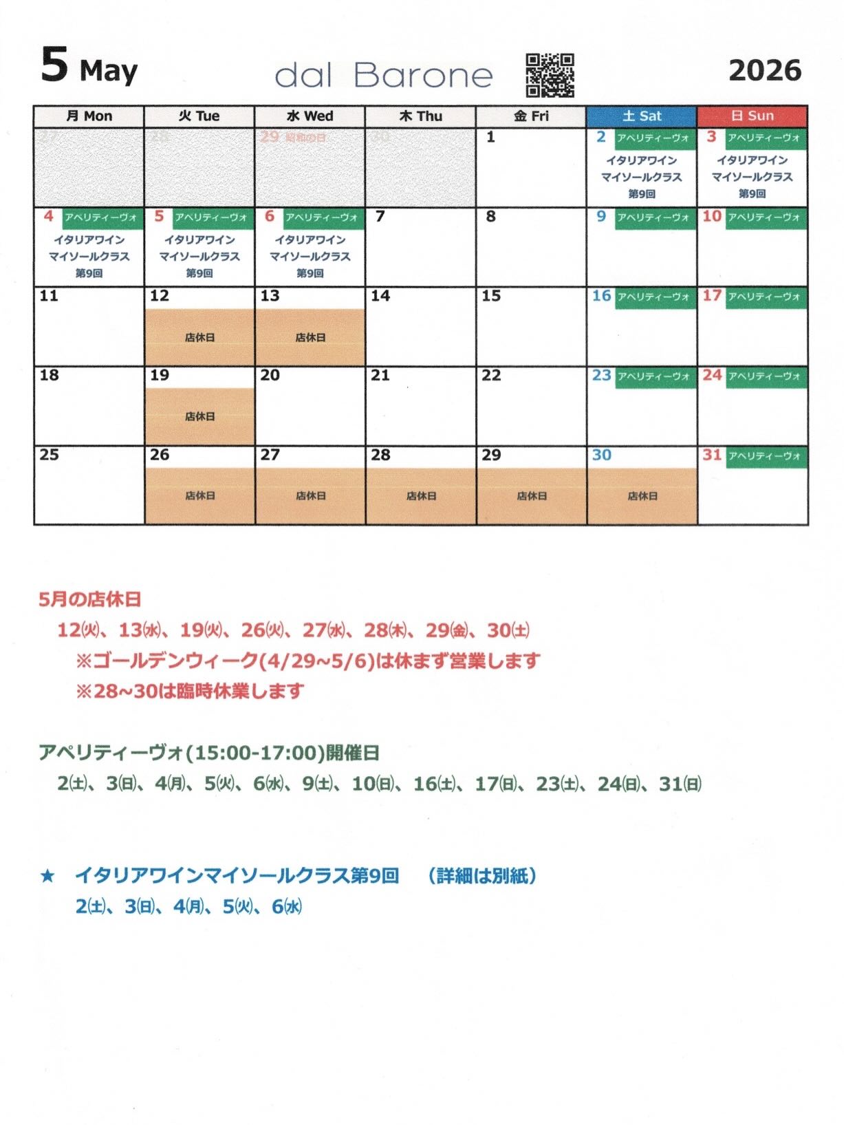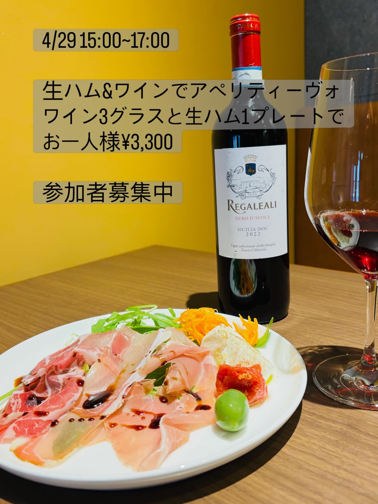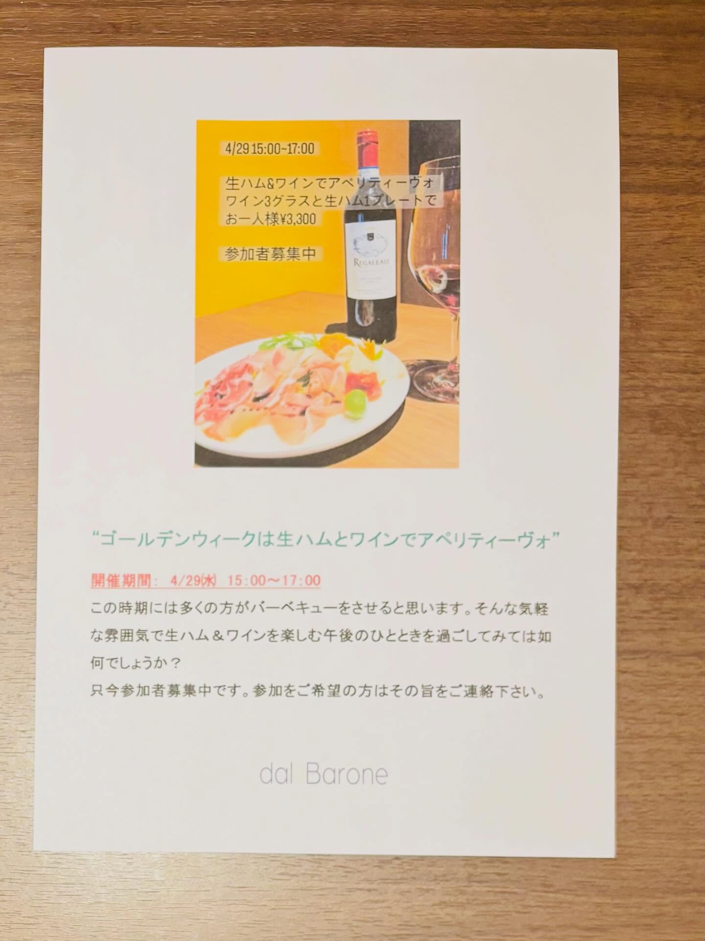 恒例のイタリアワインマイソールクラスはゴールデンウィーク後半に予定しています。その代わりに4/29には“生ハムとワインのアペリティーヴォ“というイベントを開催します。ゴールデンウィークにはバーベキューなどの外飲みイベントを計画される方もいらっしゃると思いますが、それと同じような意味合いのカジュアルなイベントです。ちょっと浮かれた気分で昼下がりのワインをお楽しみいただきたいと思います。